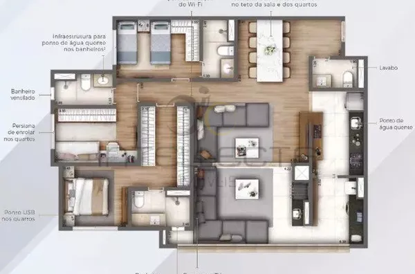 Área de lazer completa: hall social, pet place, bicicletário, salão de jogos, academia, salão de festas, espaço gourmet, churrasqueira, brinquedoteca, playground, quadra recreativa, piscinas com solarium, bangalôs e deck molhado.